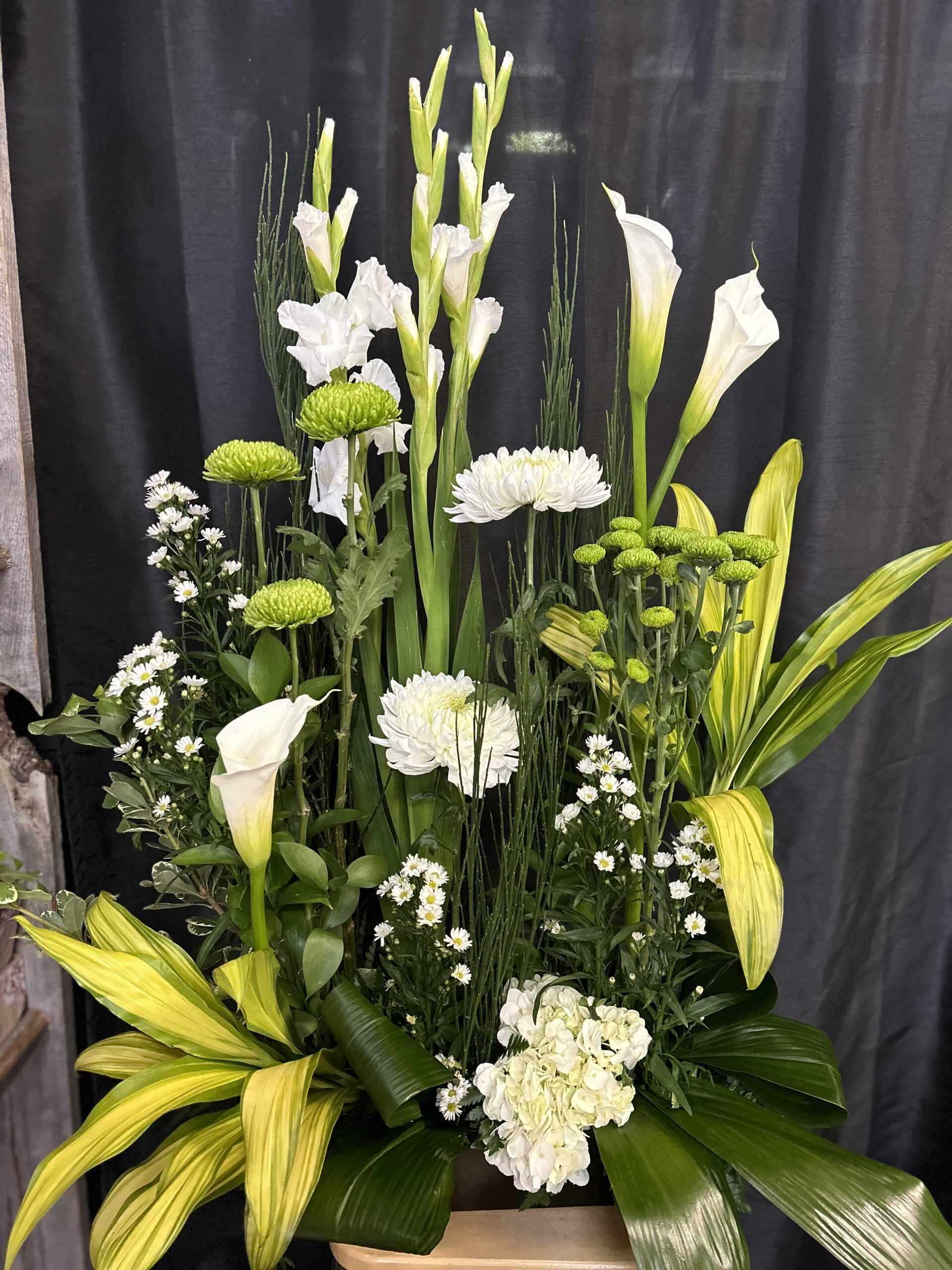 Corbeille funéraire thématique blanc et vert.